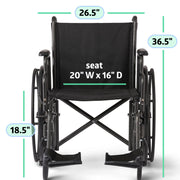 • UNMATCHED COMFORT AND SUPPORT: This comfortable wheelchair for seniors and adults has an 20"W x 16"D seat; swing-back, desk-length arms for easier lateral transfer and access to desks and tables; swing-away leg rests for easier accessibility in and out of the wheelchair